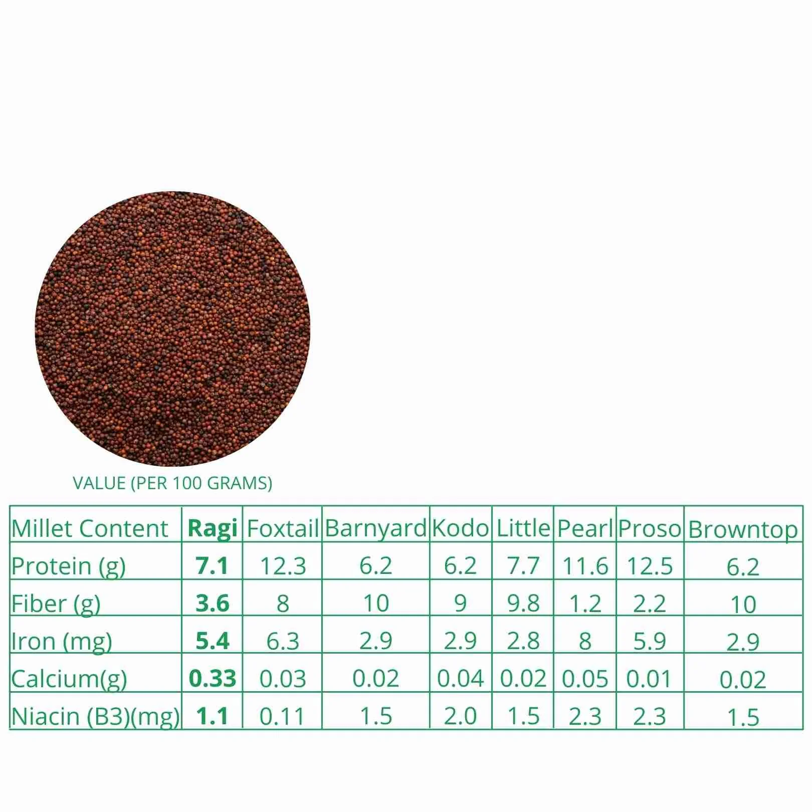 Our organic Ragi Millet is rich in calcium, fiber, minerals and amino acids. Unpolished Ragi Millet, is a high source of Calcium- it contains over 3 times more calcium than milk.